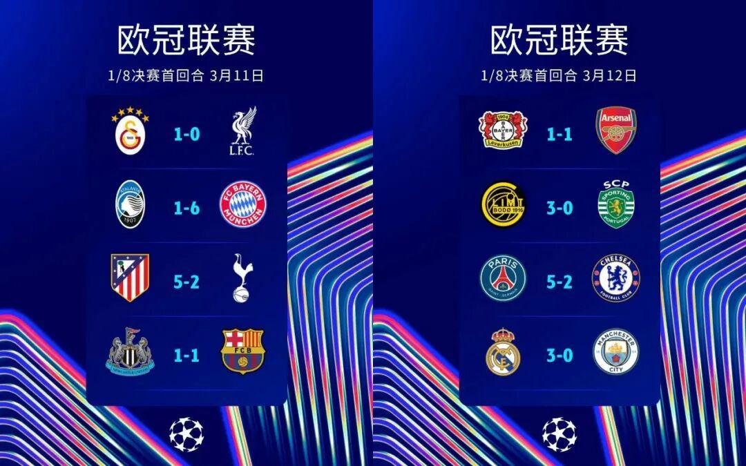 随着北京时间今日凌晨四场比赛结束,欧冠1/8决赛首回合较量全部结束。首回合西甲球队整体表现最优:马德里竞技5比2大胜热刺,皇家马德里3球横扫曼城,仅有巴塞罗那客场1比1逼平纽卡未能得胜;德甲球队同样发挥不俗,拜仁客场6比1狂胜亚特兰大,勒沃库森则是逼平了联赛阶段取得8连胜的阿森纳;反倒是六队晋级十六强的英超一胜难求,曼城、切尔西、热刺均3球落败,利物浦客场再度不敌加拉塔萨雷,六队仅取得2平4负的成绩,丢球数更达惊人的16球;但最令人眼前一亮的还是淘汰赛新军“闪耀哥”,挪威劲旅博德闪耀3比0完胜葡萄牙体育,豪取欧冠五连胜,延续了神挡杀神的黑马风采。