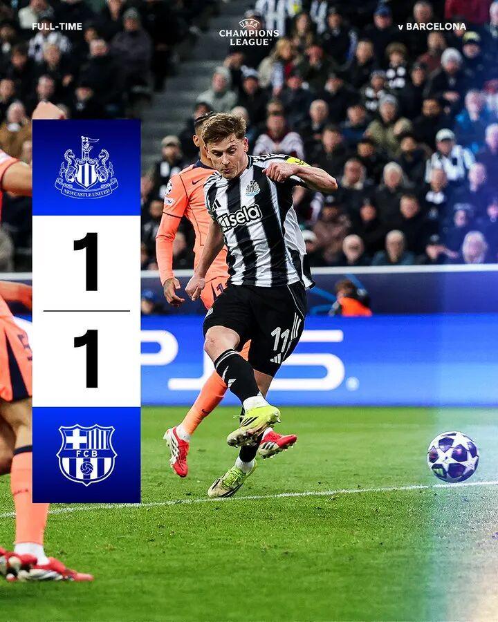 北京时间3月11日凌晨4点,欧冠1/8决赛首回合较量,纽卡斯尔联主场挑战巴塞罗那。上半场比赛,双方屡造进攻机会,拉姆斯代尔和霍安·加西亚贡献多次扑救。下半场比赛,乔林顿破门因越位在先被判无效,哈维·巴恩斯中路抢点帮纽卡先下一城,补时阶段,奥尔莫禁区内突破被绊倒,亚马尔点射绝平。最终,纽卡斯尔联1比1遭巴塞罗那逼平,双方次回合将移师诺坎普球场决出晋级者。