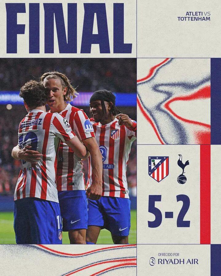 北京时间3月11日凌晨4点,欧冠1/8决赛首回合较量,马德里竞技主场迎战托特纳姆热刺。上半场比赛热刺后场灾难发挥,开场6分钟门将金斯基传球失误,略伦特破门,随后范德芬接球时滑倒送格列兹曼单刀再下一城,仅仅1分钟后,金斯基再送大礼,阿尔瓦雷斯笑纳扩大比分,金斯基随即被换下,勒诺尔芒补射破门,波罗低射扳回一城,罗梅罗头球中柱。下半场比赛,阿尔瓦雷斯后场反击长途奔袭完成双响,奥布拉克同样送礼,索兰克再扳一球。最终,马德里竞技5比2大胜托特纳姆热刺,送对手各项赛事6连败。