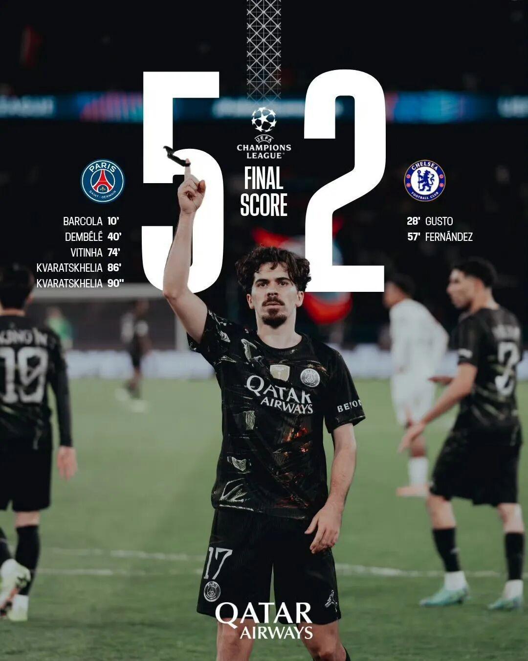 北京时间3月12日凌晨4点,欧冠1/8决赛首回合较量,巴黎圣日耳曼主场迎战切尔西。上半场比赛,佩德罗失良机,内维斯头球做球,巴尔科拉抽射首开记录,登贝莱中柱,古斯托扳平比分,随后登贝莱凭借个人能力1对2破门得分。下半场比赛,约恩森化解巴尔科拉单刀,恩佐推射再度扳平比分,约恩森送大礼,维蒂尼亚挑射轻松破门,佩德罗进球因越位在先被吹,尾声阶段,克瓦拉茨赫利亚内切轰出一脚世界波洞穿约恩森大门,李刚仁进球也因越位在先被吹,克瓦拉茨赫利亚推射完成梅开二度。最终,巴黎圣日耳曼主场5比2大胜切尔西,双方次回合比赛将移师斯坦福桥球场。